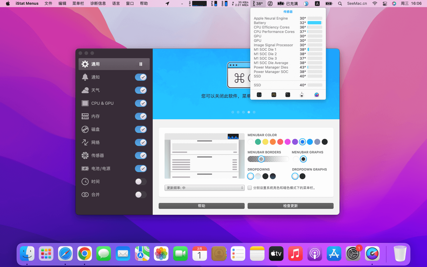 mac系统活动监控器 特别提醒:天气不可用,等以后更新修复 软件介绍 iStat Menus 是一款位于macOS状态栏菜单的系统活动监控器,可以帮助您轻松监控系统活动和资源使用情况。您可以及时查看分析您的CPU和GPU,内存,磁盘,网络,温度,电池以及系统时间,稳定且占用资源少,是用于监控系统状态的不二之选。