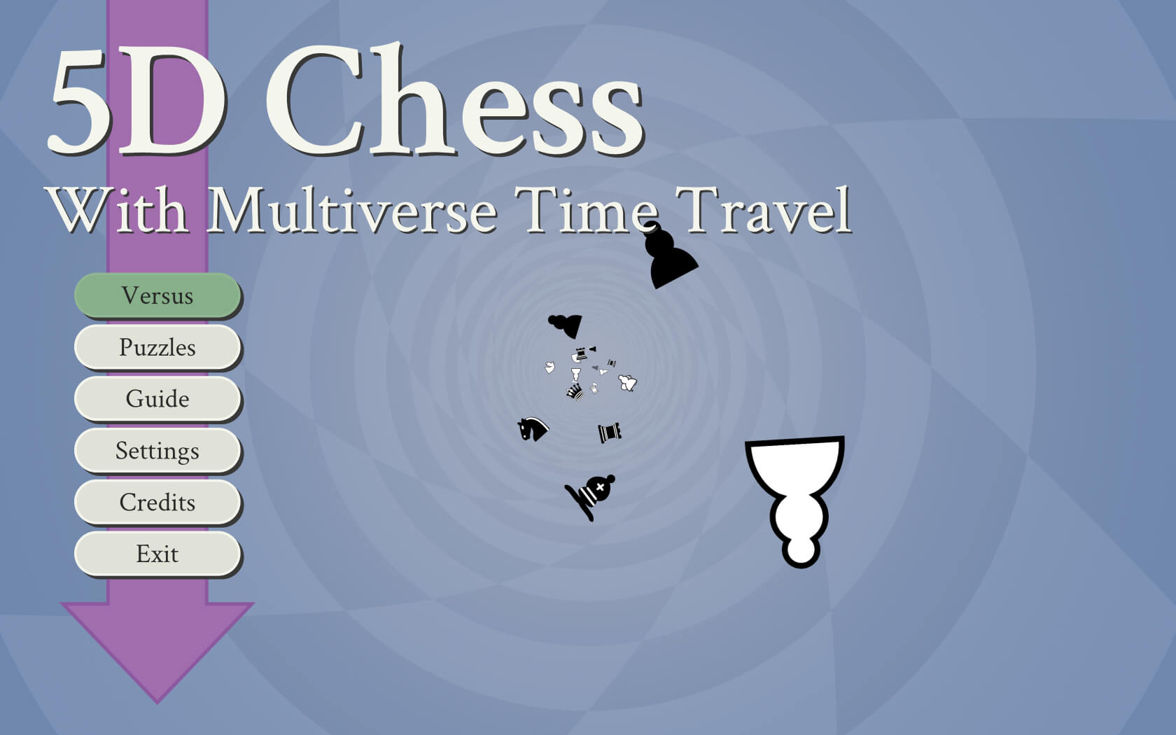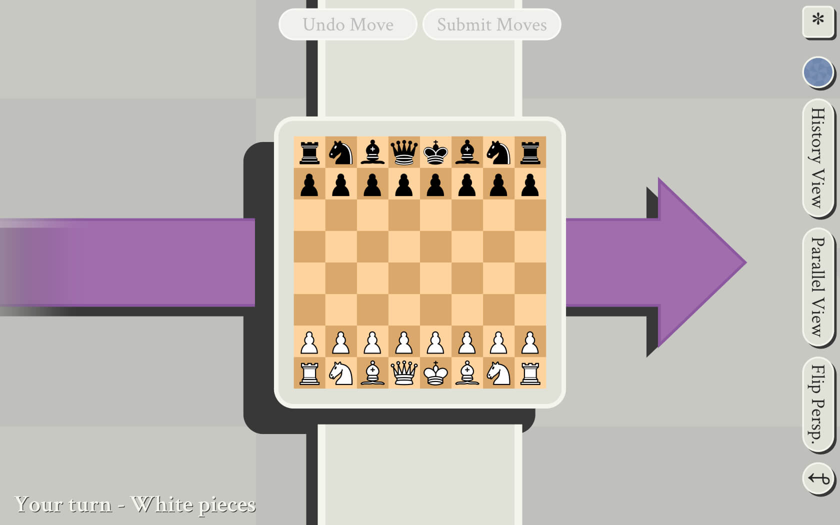 和传统的国际象棋相比,这游戏多了一个时间轴。你的任意棋子可以通过穿越时空返回到过去的位置(或者去已经存在的未来),并且过去的这个棋子不会消失!穿越回过去之后就会开创一条新的时间线(我们把一开始的时间线称为主世界,其他依次称为平行世界1、2、3),新的时间线(平行世界1)的时间进度比原有时间线(主世界)要早,也就是说你回到了早几步之前的时间。