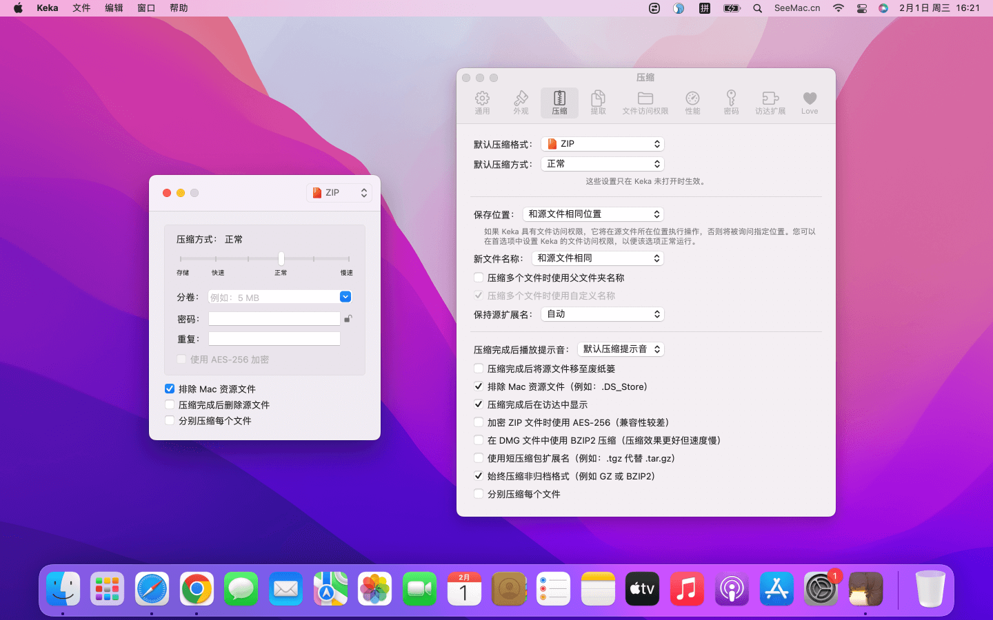 Keka是一款功能强大且易于使用的基于7za端口的macOS文件归档器,无需打开 Keka 来压缩文件,只需将Keka添加到Dock栏中,然后将文件和文件夹拖放到 Dock栏 上的 Keka 图标即可快速的创建压缩文件。