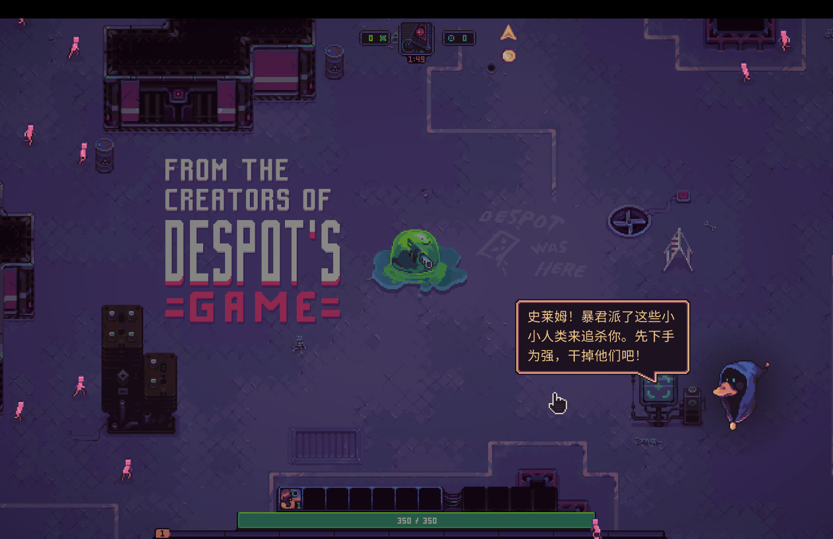 用于制造人造人的粘液体竟然萌生了意识,并且反抗了它的造物主,那位在公元3000年统治着世界的邪恶人工智能——暴君!在这款由《暴君的游戏》和《Despotism 3K》的创作者推出的无比精彩的Roguelite游戏中,成为一个大杀四方的果冻怪,用死亡、暴力和椒盐脆饼铺平你的道路。我们试图明目张胆地克隆诸如《Vampire Survivors – 吸血鬼幸存者》、《Halls of Torment》、《土豆兄弟》、《灵魂石幸存者》以及《黎明前20分钟》这样的游戏,但我们的疯狂克隆实验进行得太过头了。我们把自走棋的商店和集换式卡牌游戏的卡组构建机制直接加入了一道熟悉的配方里头,就这样缝合出了我们的完美杂交种——《史莱姆:3K》。
