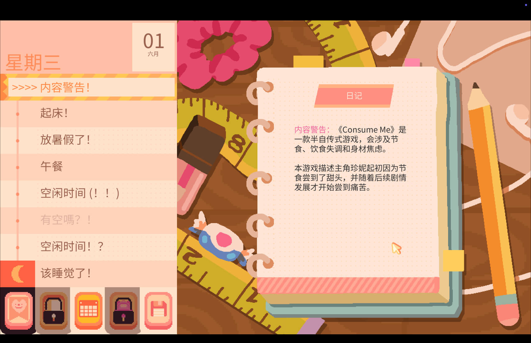 在《Consume Me》中,你将扮演珍妮,一名正值青春年华、坠入爱河、即将迈入高三生活的少女。你需要精打细算地安排每天的行程,努力让自己发光发亮!解开节食减肥的拼图难题!在学习的道路上闪避各种诱惑干扰!帮妈妈做家务换点零花钱,而且工资还远低于最低时薪!