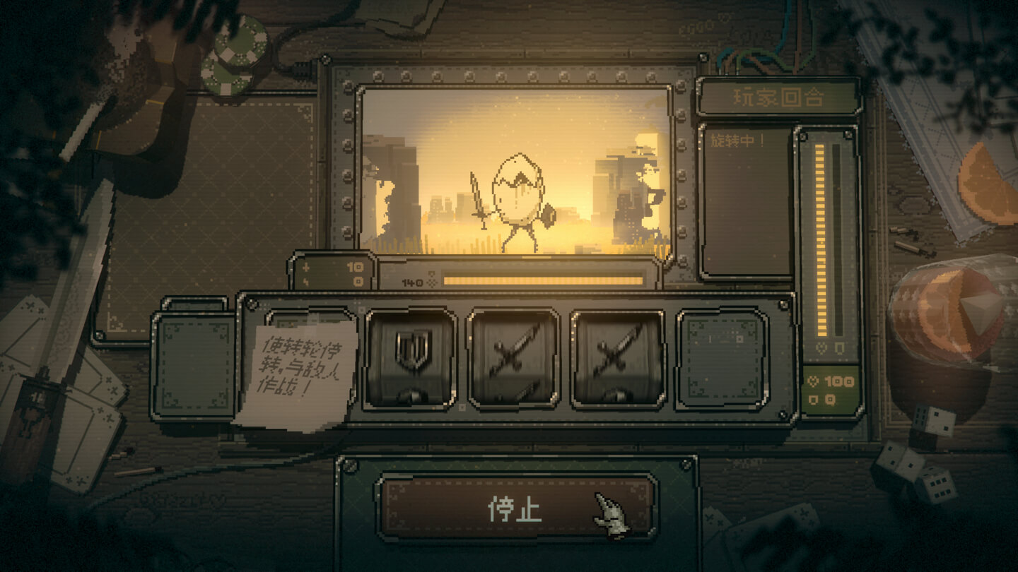 这是一款融合复古风格与迷你肉鸽玩法的老虎机游戏。握紧匕首——开始旋转轮盘吧!