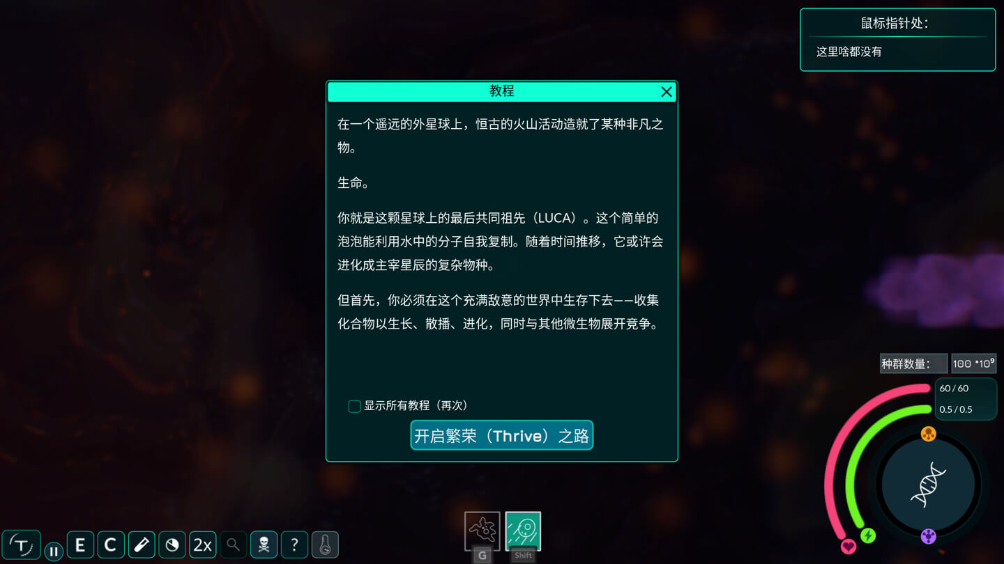 在《繁茂生命》中,你将操控一个外星生物,从最后的宇宙共同祖先(LUCA)开始。你的目标是在恶劣的环境中生存,通过基因突变来适应环境,并最终繁衍生息。其他物种将会出现并与你竞争。它们会通过种群动态驱动的模拟进化,并伴有随机突变——你必须不断改进和传播你的物种,才能超越它们。你的物种能否成功,取决于你作为单个细胞的生存能力以及你在编辑器中所做的改变。