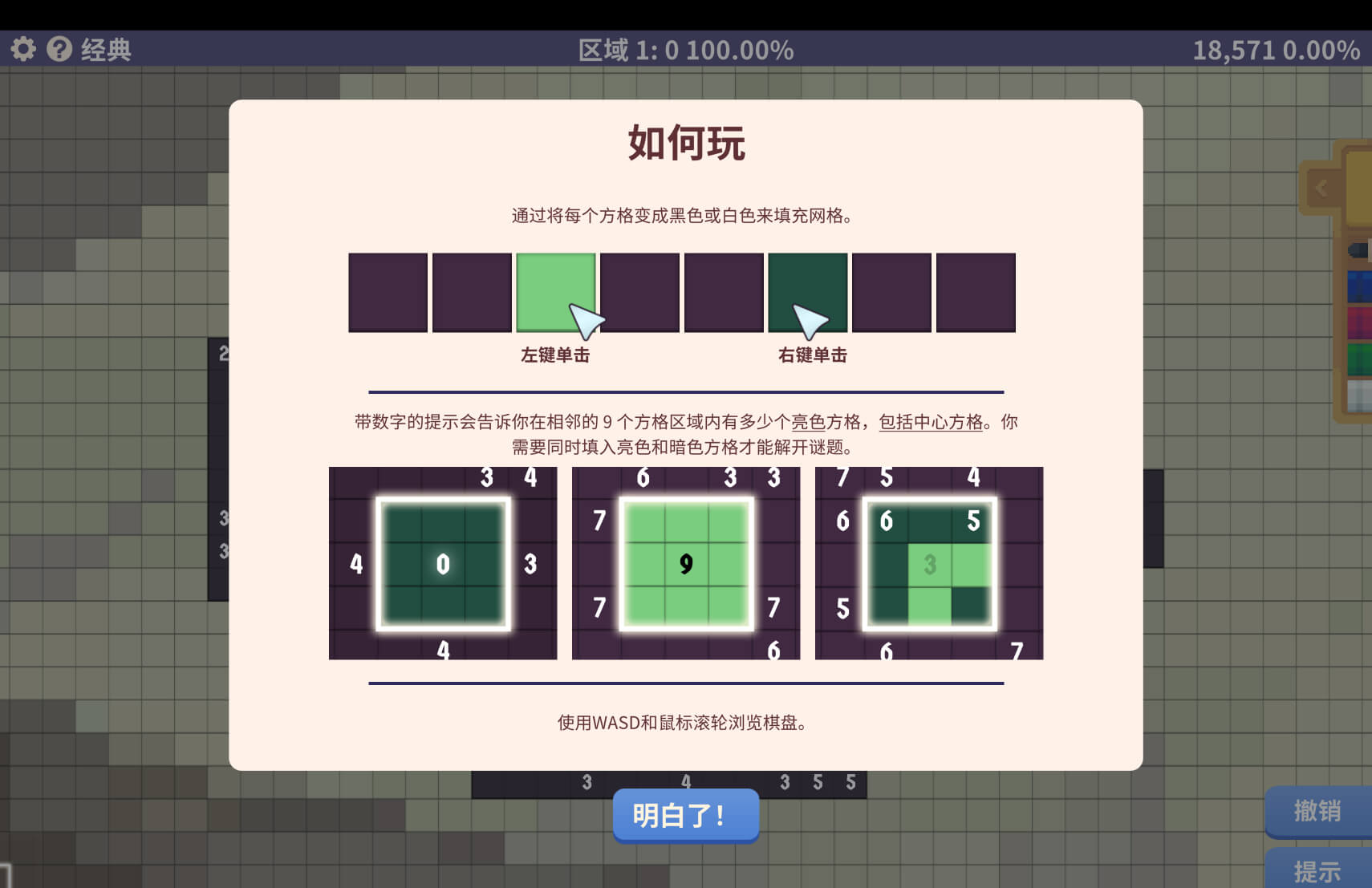 如果你知道如何玩扫雷,你就已经知道如何玩马赛克游戏!数字线索(0-9)表示在线索的1个方格内必须放置多少个亮色方块。